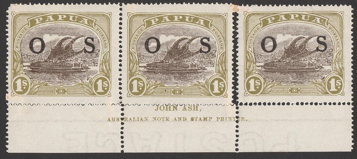 Lakatoi 1/- brown & yellow-olive Ash imprint strip of 3 with left 2 (pos 37 & 38) officially replaced by PO with pos 34 & 35 with sm pieces of selvedge to attach. VF fresh MNH. SG O64 cat £27 as hinged singles, so £54 MNH, plus premium