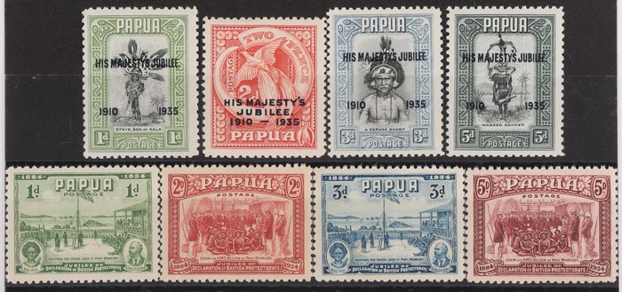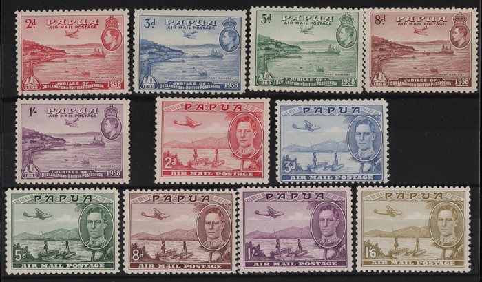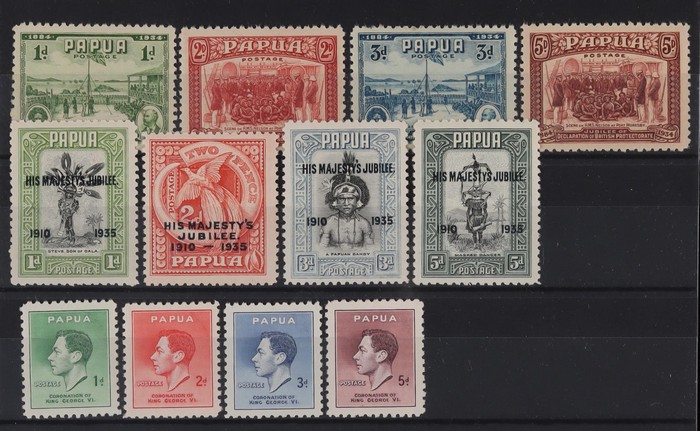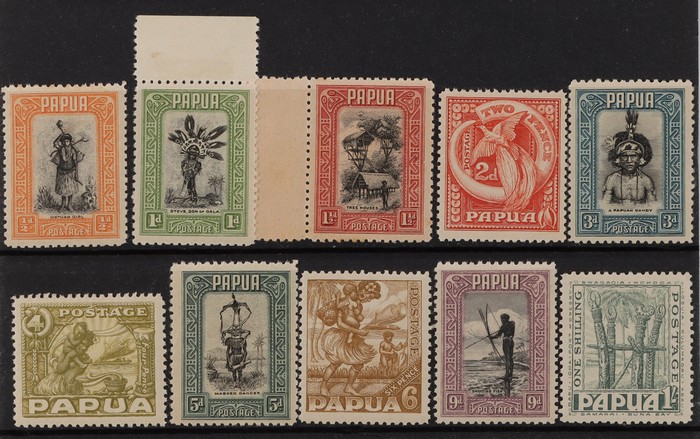 selection inc 1901-05 Lakatoi BNG 1/-, horiz wmk. 1906 Large Papua 1/-, horiz wmk. 1911-15 Lakatoi Monocolour set. ½d to 2/6 inc both ½d shades & 1d perfs. VF MNH. SG 7, 19, 84-92 cat £226 for M, should be at least double,