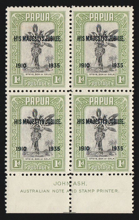 Jubilee opt Pictorial 1d variety 'accent flaw' on LL stamp of Ash imprint blk of 4. VF MNH, gum sl tropicalised. SG 150a+150 cat £52 for M singles, should be at least double, £104 MNH, plus premium for imprint blk. (P) (Image1)