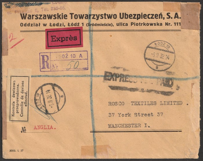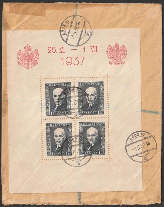 of Romania 1zl (4) black M/Sheet. VFU, tied to Registered Express cover by 'Lodz 8 11 38' cds, to England with currency control label. SG MS332c cat £44++. Mi Blk 4 cat €50++ - both as loose M/S, plus large premium for on cover. (Image1) (Image2)