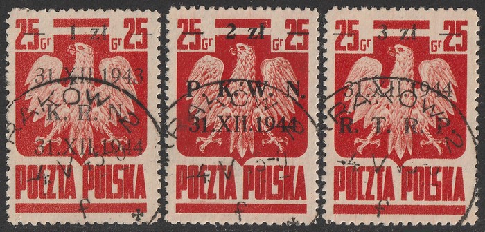 set 1zl/25gr to 3zl/25gr red. VFU, 'Krakow 4 V 45' cds. SG 504-6 cat £24+. Mi 386-88 cat €25+. Scarce genuine used. Exp Ceremuga AIEP. (3) (Image1)