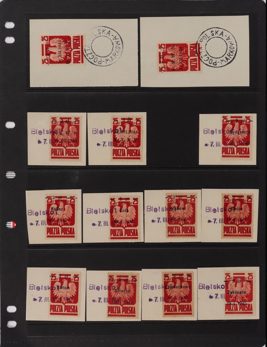 RTRP (2ea) & Liberation opts (9 diff) VFU - 1 of ea of 1st 4 with 'Poczta Polska Markowa' cancel, the rest with 2-line 'Blelskol 7 III' cancels. SG 504/05 & ex 508-17 cat £200++. Mi 387-8, & ex 390 I-X cat €215++, plus premium for scarce