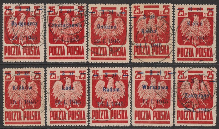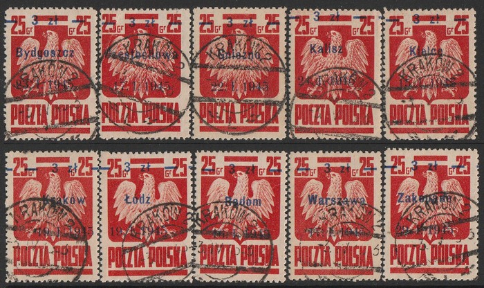 Town cds set 3z/25gr red. VFU, mostly with Lublin cds of various 1945 dates. SG 508-17 cat £180+. Mi 390I-X cat €200+. Scarce genuine used set. Exp Ceremuga AIEP. (10) (P) (Image1)