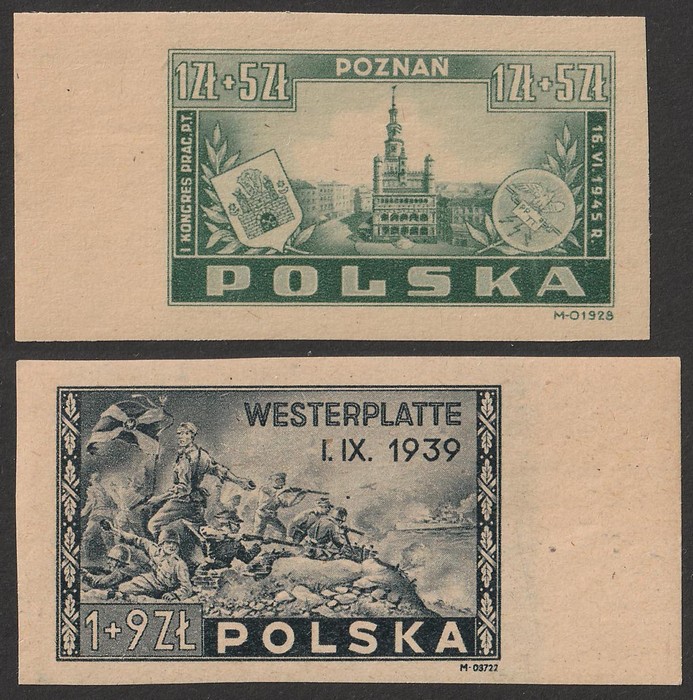 Congress 1+5zl green & Westerplatte Anniv 1+9zl black, both IMPERF, from 2nd printing. Superb fresh MNH, 4 huge margins from edge of sheet. SG 530(var) & 534(var). Mi 403U & 407U cat €270. (2) (Image1)