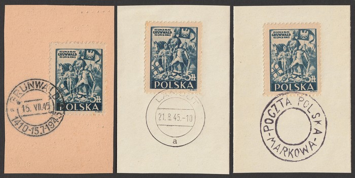 Grunwald 5zl blue. VFU, tied to pieces by 'Grunwald 1410-15.7-1945', 'Lancut 21.8.24' cds & 'Poczta Polska Markowa' provisional pmk. SG 532 cat £75+. MI 405 cat €150+. Scarce genuine used. (3) (Image1)