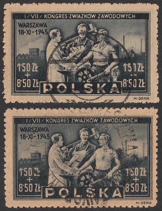 Congress 1.50+8.50zl. VFU, 1st with 'Krakow 4.XII.45' cds, 2nd with special Warszawa commem pmk. SG 546 cat £32+. Mi 413 cat €60+. Scarce genuine used. Exp Ceremuga AIEP. (2) (Image1)