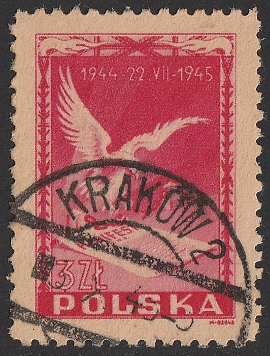 Anniv 3zl carmine. Superb U, 'Krakow 6.X.45' cds. SG 533 cat £31+. Mi 406 cat €40+. Scarce genuine used. Exp Ceremuga AIEP. (Image1)