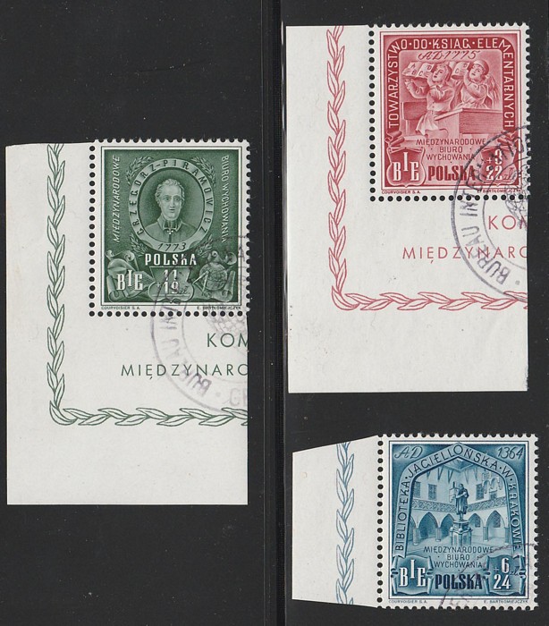 Bureau of Education set 3+11zl - 11+22zl. VF U/CTO, part special 'Bureau Internationale de Education Geneva' cds, all marginal or cnr marginal. Mi 445-447 cat €260+, SG MS571a-c cat £300+. Very rare with the BIE cachets. (3) (P) (Image1)