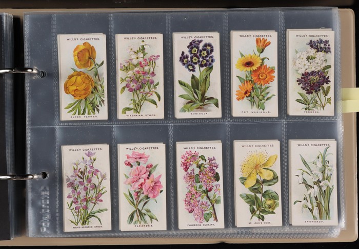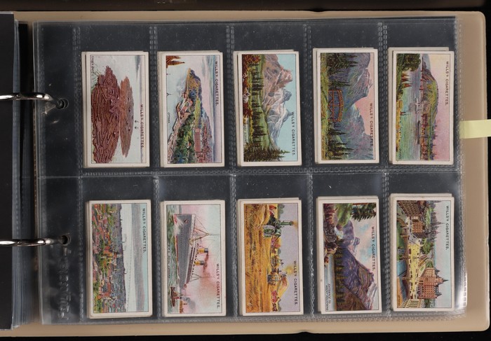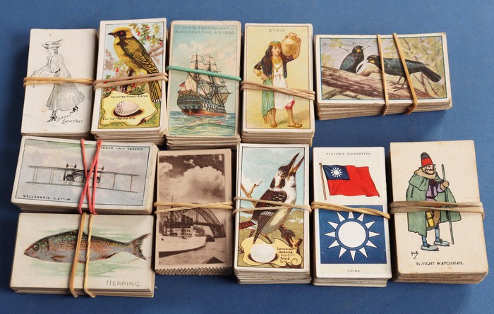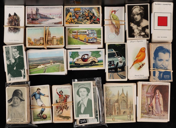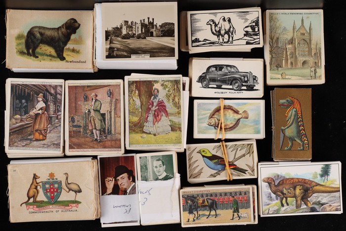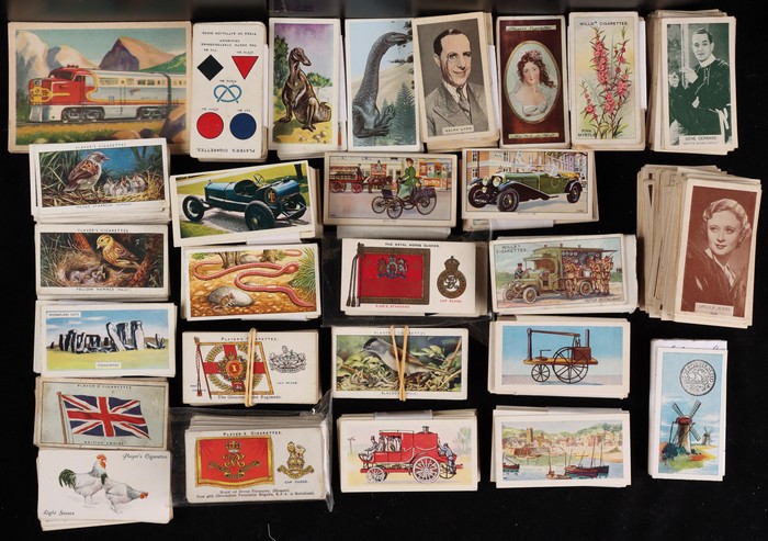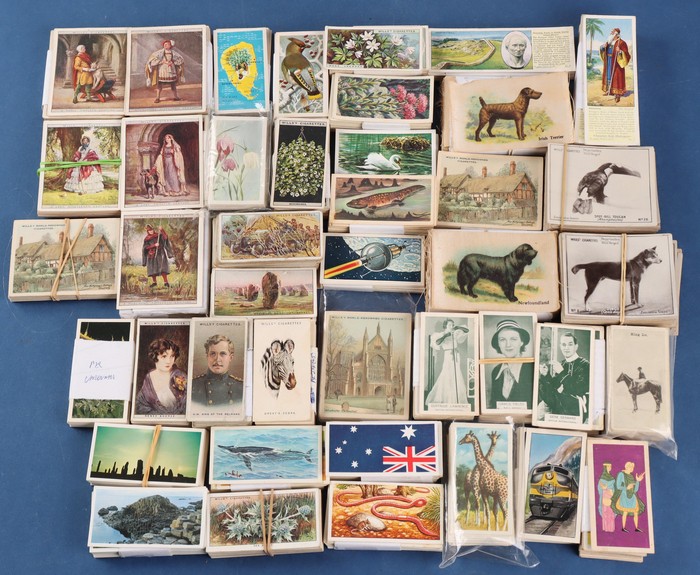 742 imagePlayer & Sons group with 11 diff sets/part sets inc Army Corps & Divisional Sign (120 mixed, cat £100), Aviary Birds set of 50 (£50), Dogs (40, cat £40). Drum Banners & Cap Badges (60, £50), hints on Association Football (set of 50, £50), Regimental Colours (untitled) set of 50 (cat £65), Regimental Standards & Badges (40, £35). Generally F-VF condition, total cat £450. Then State Express (Ardath) British Born Film Stars sets of 50 (4, cat £100 ea, £400). Turf Cigarettes (Carreras) Film Stars (1949) set of 50 (£150). Can venders Ancient Egypt set of 25 (£40). BAT Best Dogs (silk, 80 mixed, cat £6 ea, £480). Chess Cigarettes (Hignett Bros) Beauties set of 50 (cat £80). Godfrey Phillips (Aust) Film Stars (150 mixed, cat £300). Wills (mostly Australian) with 9 diff inc Australian Wild Flowers set of 50 (£75). Australian Scenic Series (100 real photos, £120), English Period Costumes set of 25 (4, cat £50 ea, £200), Famous Film Stars (set of 100, £160), Historic Events set of 50 (£75), Military Motors set of 50 (£90), Riders of the World set (£90) & Nations Shrines set of 25 (2, £80) with total Wills cat £800+. Overall generally F-VF, total cat £2700 = A$5800. lso 1970s English cig-card size trade cards (700). Unchecked as received. (Many 100s) (Image1) (Image2) (Image3)