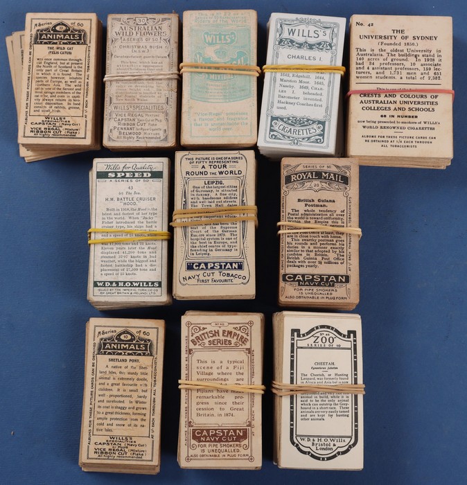 744 imageWills collection with Australian Wild Flowers (lilac backs, 35, cat £50), A Tour Round the World (60, £190), British Empire Series (40 mixed, £50), Crests & Colours of Australian Universities (35, £30), Kings & Queens (48, cat £7 ea - £335), Riders of the World (45 mixed, £80), Royal Mail (40, cat £200), Speed (40 mixed, £20), Wild Animals (cut-outs, 50 mixed, cat £60), Zoo (real photos, 50). Generally F-VF, cat £1000 = A$2000. (440) (Image1) (Image2)