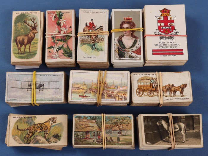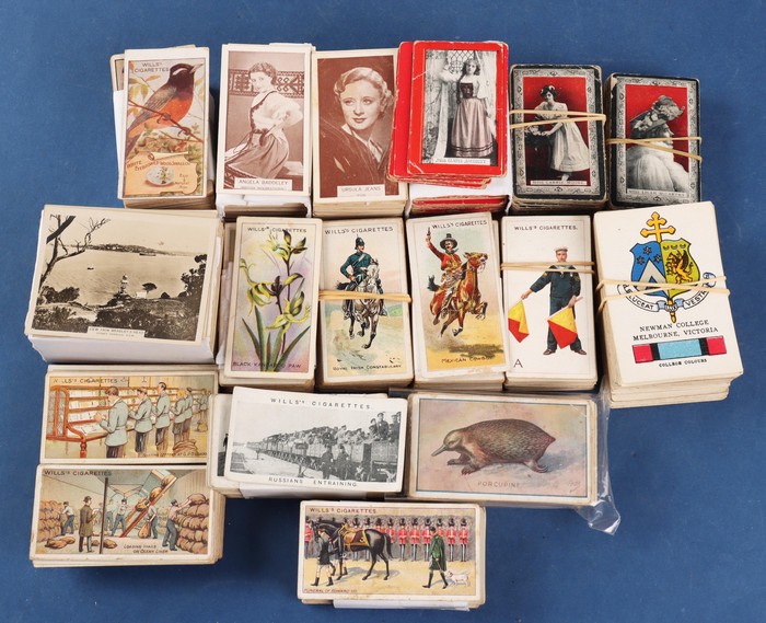 747 imageCigarette Cards: Wills collection with Australian issues (12 diff) for Actresses Capstan backs (35, cat £120) & Vice Regal backs (50 cat £175). Australian Scenic Series set (100, £120), Australian Wild Flowers (40, £50), Birds of Australasia (100, orange backs cat £175), Crests & Colours of Australian Universities & Colleges (60, £50), Historic Events (40, £60), Riders of the World set of 50 (2, cat £180), Royal Mail set of 50 (2, with Capstan or Vice Regal backs, cat £100), Signalling set of 50 (Capstan backs, £85), War Pictures (60, £130), Famous Film Stars (100, 2 sets cat £320). Also Peter Pan Animals & Birds (50, cat £225) & Anonymous (BAT ?), 1902 Actresses (100) with red borders, est cat £300. Total £2290 = A$4400. (Image1)