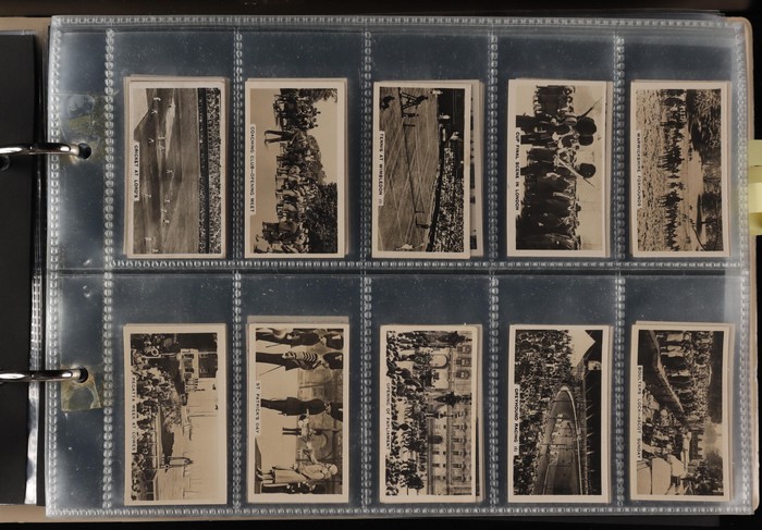 741 imageNeat array with American Tobacco Co Old & Ancient Ships (40 mixed, cat £320) & Fish From American Waters (20 mixed, £300). Players National Flags & Arms (40/50, £20). Sniders & Abrahams Animals & Birds (40 mixed, £200). Wills Birds of Australasia Capstan backs (40, cat £70), Girls of all Nations (40 plain back, plus Capstan back, cat £3 ea = £120). Birds of Australasia (Vice-Regal backs, 46, cat £80), Merrie England (3 Castle backs) (30/40, some foxing, cat £9ea = £270), Sketches (Capstan backs, 20 cat £55), Speed (50, £20). Also United Discounts (Park House Sydney) 1930s mixed Views (30) inc Sydney Harbour Bridge & SS Malabar Wreck. Some mostly light foxing or aging. Mostly F-VF. Total cat £1400+ = A$2800. (400) (Image1)