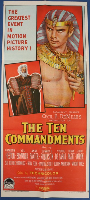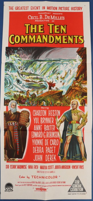 760 imageMovie Poster: 1956 'The Ten Commandments' inc Charlton Heston, by Paramount Pictures, colour printed in Sydney, 35x75cm. (Image1)