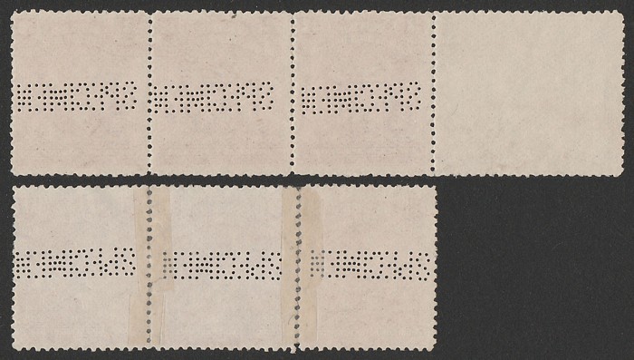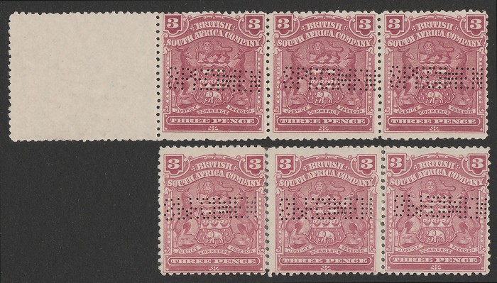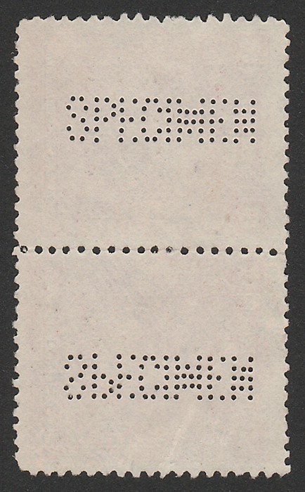 claret, 2 horiz strips of 4, 1st stamp perf SPECIMEN horiz normal. 2nd strip all perf SPECIMEN horiz inverted. F-VF UN, 2nd strip reinforced, perf separation etc. SG 81s(var) cat £100 as normals, plus premium for scarce multiples. (6) (Image1) (Image2)