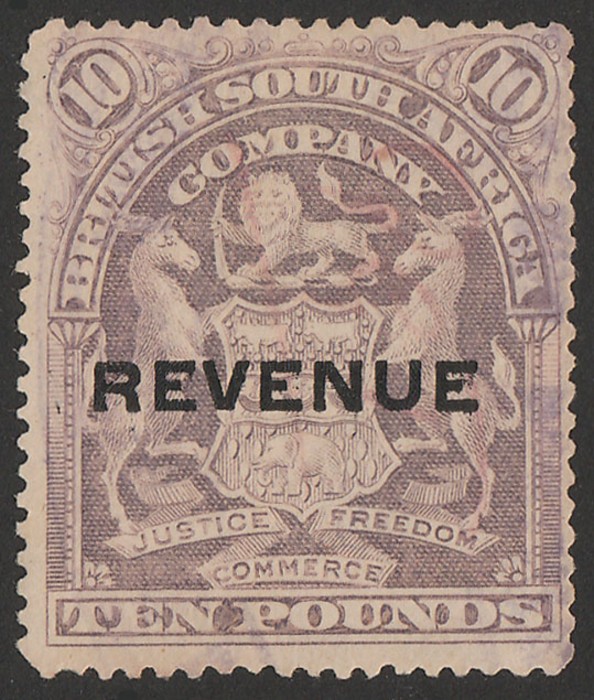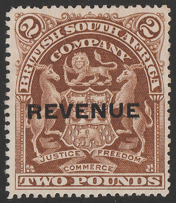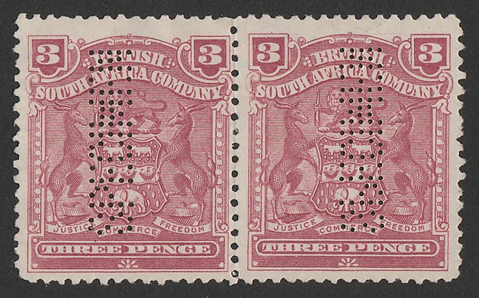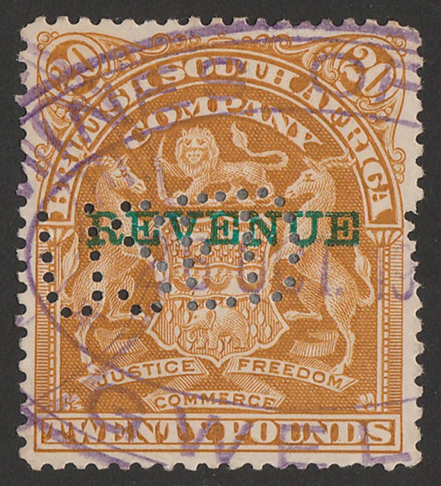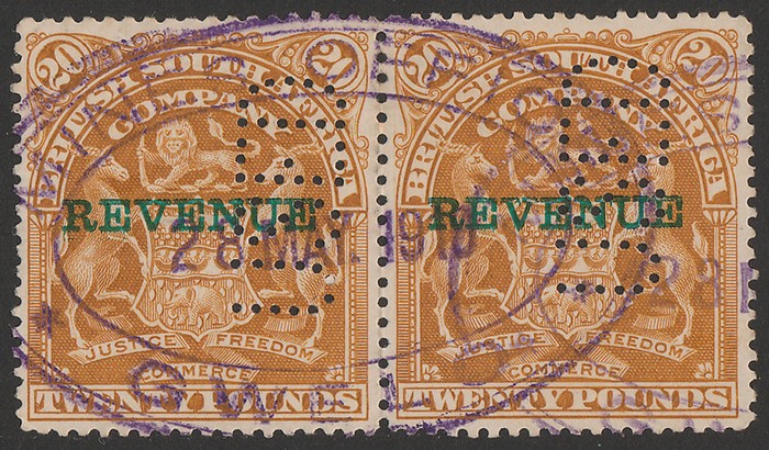 Arms £20 yellow-brown, horiz pr. Superb F/C, perfin 'USED', plus oval violet 'Mines Office 28 MAY 1910 Gwelo'. Bft 23 cat £400+. Rare multiple. (2) (P)