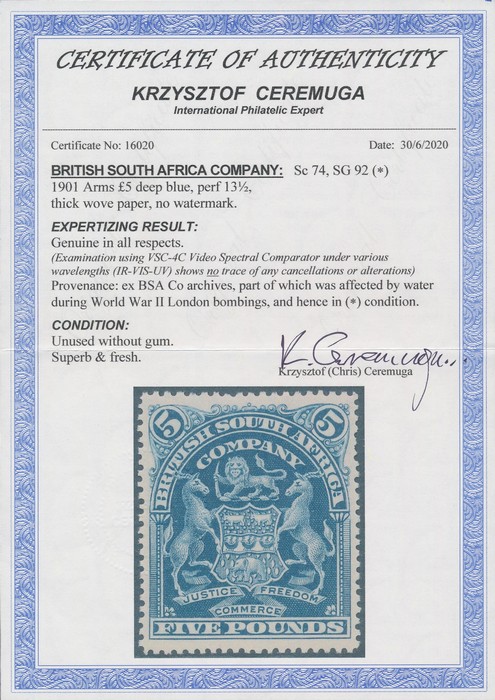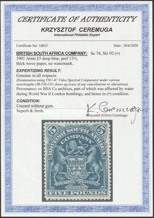£5 deep blue, perf 14½. Superb fresh UN (ex BSAC archives, which were flooded during WWII bombings). Scott 74 cat US$4000. SG 92 cat £3500. Rare genuine unused high value. 2020 Ceremuga photo cert (P) (Image1) (Image2)