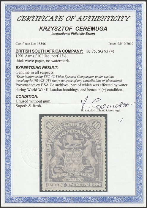 £5 deep blue & £10 lilac, perf 14½. Superb fresh UN (ex BSAC archives, which were flooded during WWII bombings). Scott 74 & 75 cat US$7750. SG 92 & 93 cat £7500. Rare genuine unused top values. 2020 Ceremuga photo certs. (2)