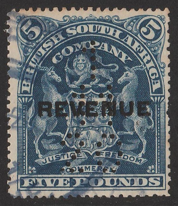 Arms £5 blue. F-VF F/C, perfin plus blue oval cancel. Bft 21 cat £35. (Image1)