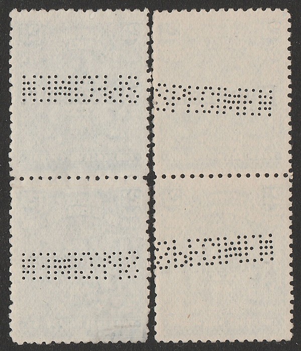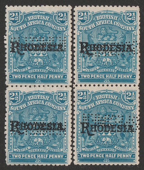 opt Arms 2½d pale dull blue, 2 vert prs, perf SPECIMEN horiz, 1 pr letters reversed top stamp & inverted bottom stamp & the other pr top stamp letters inverted & reversed while the bottom stamp is normal. VF UN. SG 103s(var). Scarce. (4) (Image1) (Image2)
