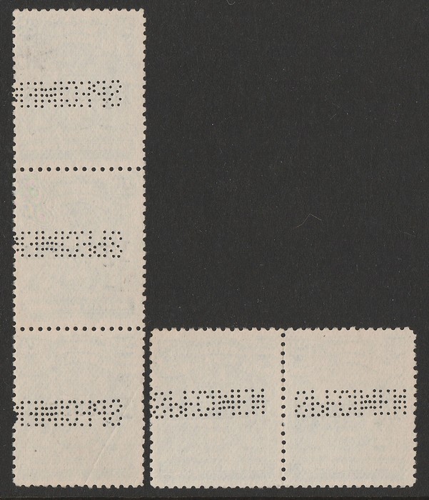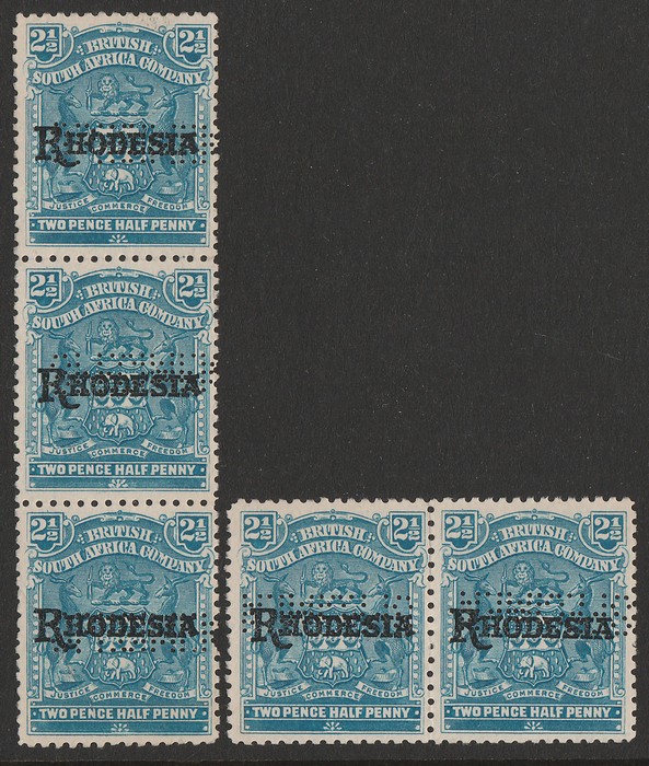 opt Arms 2½d pale dull blue, horiz pr, plus vert strip of 3, all perf SPECIMEN horiz, the pr letters inverted & reversed & the strip top & bottom stamps letters normal, while the middle stamp letters inverted & reversed. VF UN. SG 103s(var).
