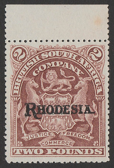 opt Arms £2 rosy-brown on sl bluish paper. Superb fresh MNH, pristine never hinged original gum, top marginal. SG 113d cat £4250 for M, should be at least double, £8500 MNH. Great rarity in such nice MNH condition & certificate can