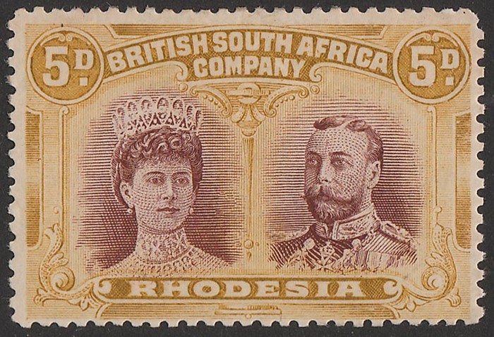 Head 5d lake-brown & green, perf 14. Superb U, on piece with 'Selukwe 3 JAN 1913 S. Rhodesia ' cds. SG 143a cat £1600+. Rare shade & desirable as postally used. 2023 Ceremuga photo cert. (P) (Image1)