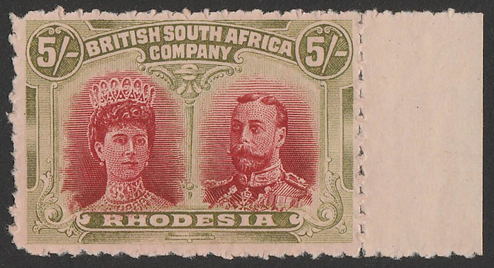 Head 5/- intense scarlet & pale olive-green, unofficially rouletted, as made from IMPERF proof sheet. VF fresh MLH, right marginal. SG 160(var), normal cat £350. (P)