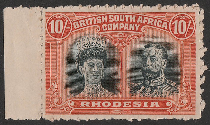 Head 10/- deep myrtle-black & orange, unofficially rouletted as made from IMPERF proof sheet. VF fresh MNH, diag LL cnr crease, left marginal. SG 160(var), normal cat £650 for M, should be at least double, £1300 MNH. (P) (Image1)
