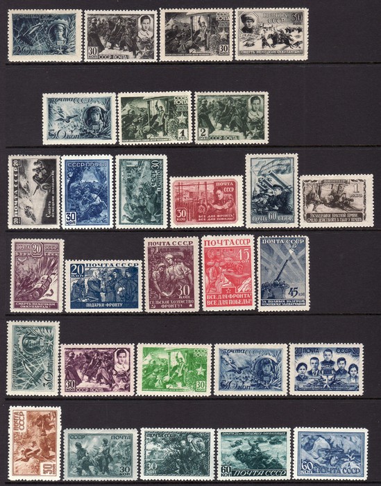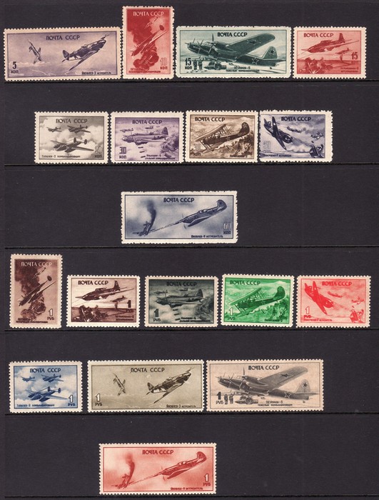 collection inc 1944 10th Anniv Stratosphere set. 1942 War Heroes (1st issue) set to 2R. 1942 War Episodes (1st issue) set to 1R. 1942 War Episodes (2nd issue) set to 45k. 1943 War Episode (3rd issue) set. 1944 Odessa Liberation set. 1944-46 Medals