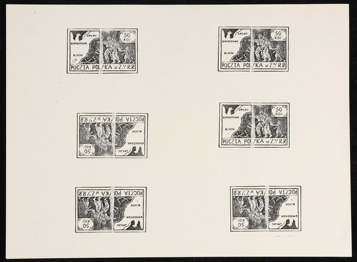 Central Asia 50k 'Dojdziemy' issue, black print from defaced plate, full sheetlet of 6 with 3 tete-beche prs. SG M16a cat £2250 as normals. Also black print from defaced die of the "Stan" map essay in a sheetlet of 6 also in tete-beche