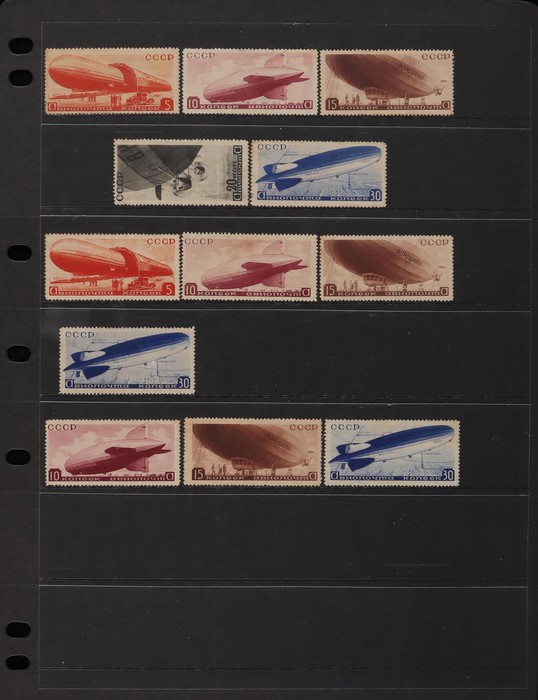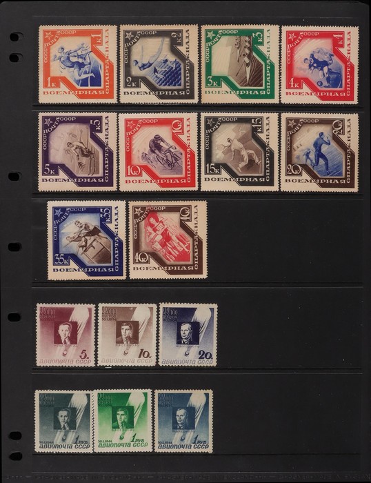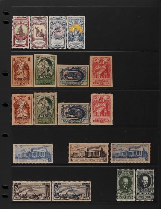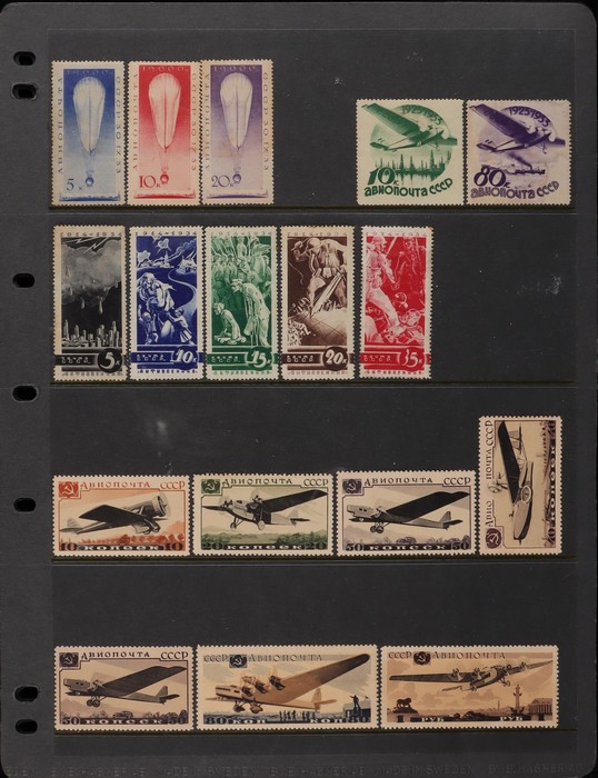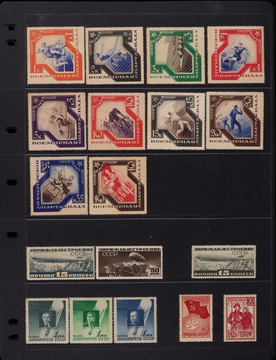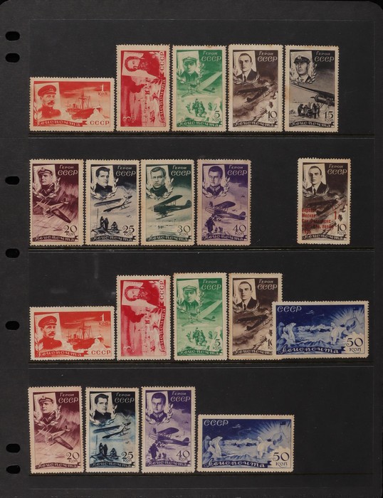 Union: 1904-46 Mint collection inc 1904 War Fund set. 1923 Agricultural set perf & imperf. 1933 Leningrad Exhibition opt set (SG cat 350). 1933 Stratosphere set (£275). 1935 North Pole Flight opt 1R on 10K (£750). 1935 Anti War set