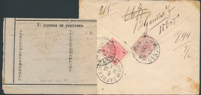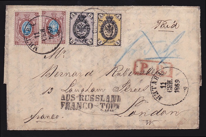 franked Arms 10k(2), 5k & 1k on horiz laid paper, tied by 'Mitava 11 SEP 69' cds -now in Latvia. To London, with boxed 'PD' h/s & 2-line 'Aus Russland Franco-Tout' h/s, plus London Paid arrival cds, & b/s of boxed 'Eydtkuhnen' b/s. SG 18, 20 & 21, Mi