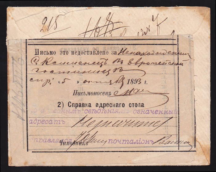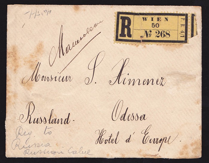 registered cover with Vienna reg label on front & franked Franz Josef 5kr & 15kr on reverse, tied by 'Wien 15 10 93' cds, to hotel in Odessa with arrival b/s, plus printed paper slip affixed to reverse about item being undeliverable. (P) (Image1) (Image2)