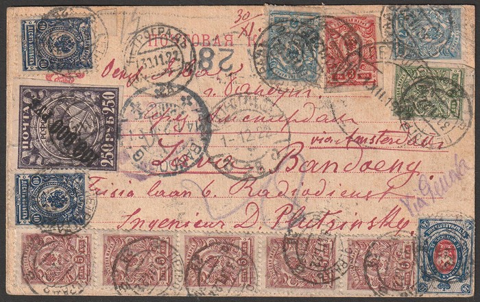franked Imperial Russia Arms (12, 6 diff) revalued at 100 times face in mixed franking with 'Science & Arts 100,000R on 250R, tied by 'Petrograd 1 12 22' cds. To Bandung in Netherlands East Indies! 'Via Genova' with arrival & transit cds. SG 111A,