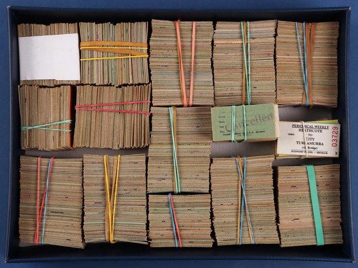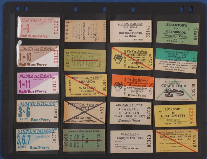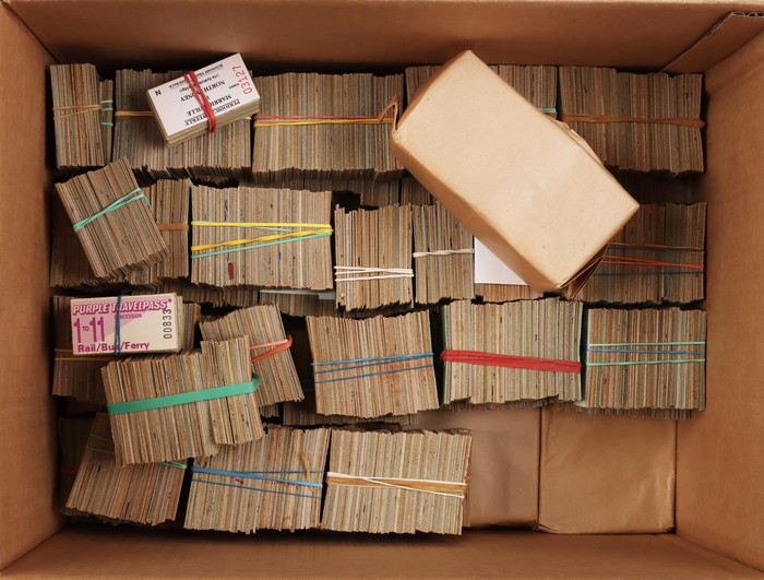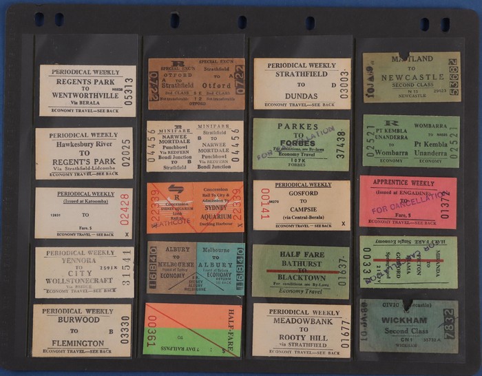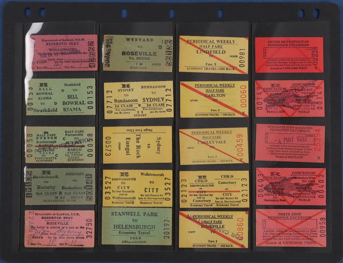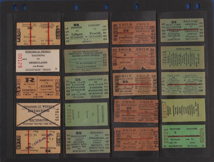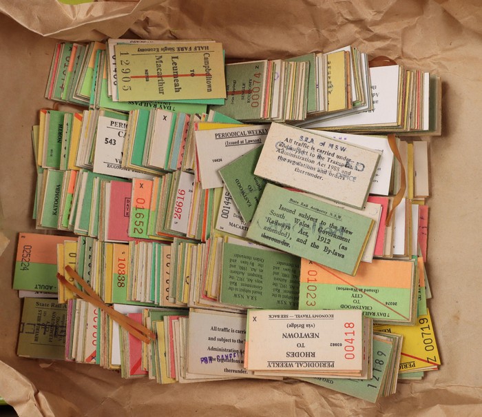 771 imageRailways. NSW Railways Tickets. Massive collection/hoard with approx 8000 NSW GR tickets, primarily from the last issues of Edmondson Tickets prior to changing to magnetic cards. Huge variety with no heavy duplication, offered as bundled up by NSW Railways. Generally VF/Excellent condition. As noted previously, hoards of such complexity/quality rarely appear on the open market. (8000) (Image1) (Image2) (Image3) (Image4) (Image5) (Image6) (Image7) (Image8) (Image9)