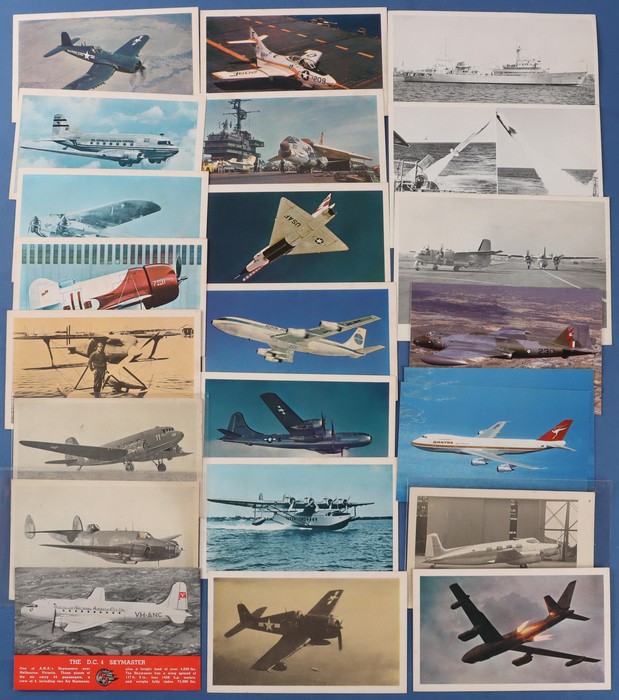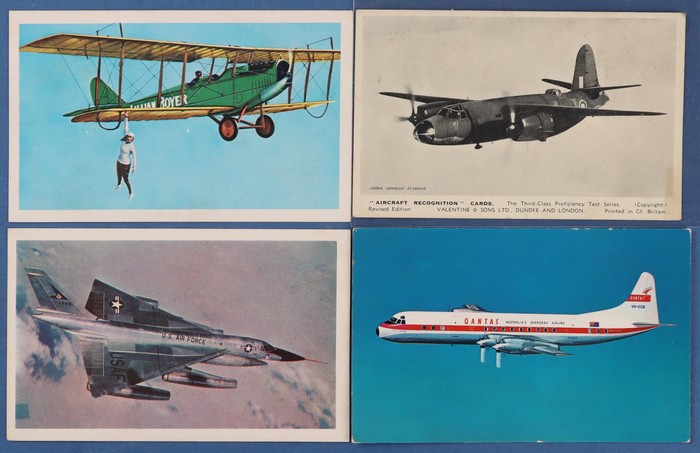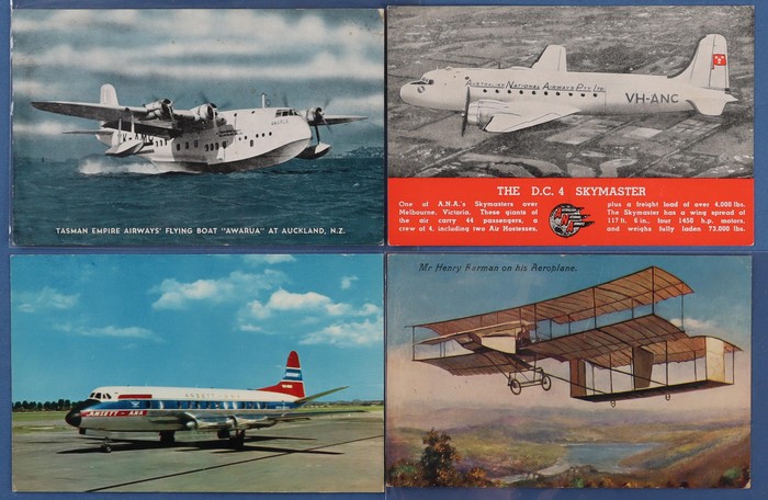 773 imageAeroplanes: Small selection with Tasman Empire Airways Flying Boat & Awarva of Auckland NZ (c1941). ANA DC4 Spymaster (2) 1960s Ansett-ANA Vickers Viscount & GB pre WWI Mr Henry Farman on his aeroplane. 1930s British aircraft recognition cards (3) & Sanitarium 1960s picture & history cards of aeroplanes (150, plus 8 other cards. Generally VF condition. (33) (Image1) (Image2) (Image3)