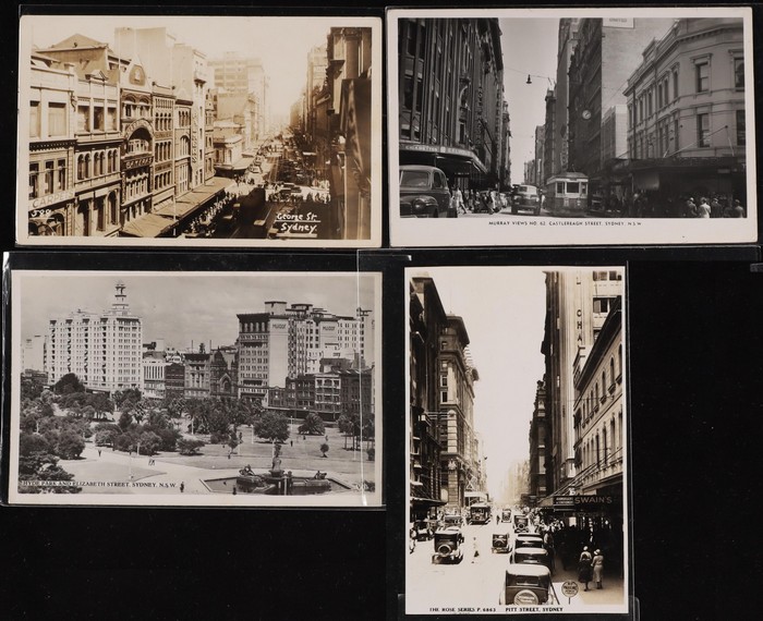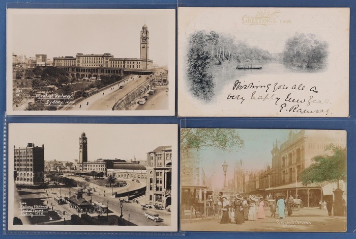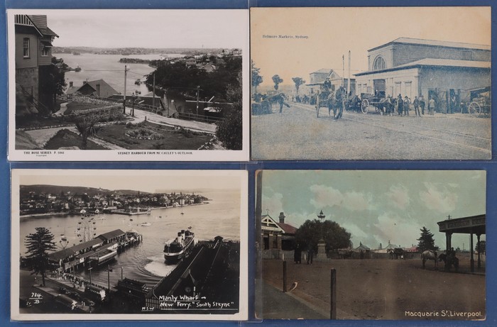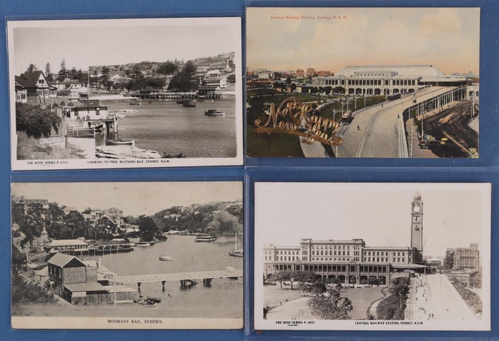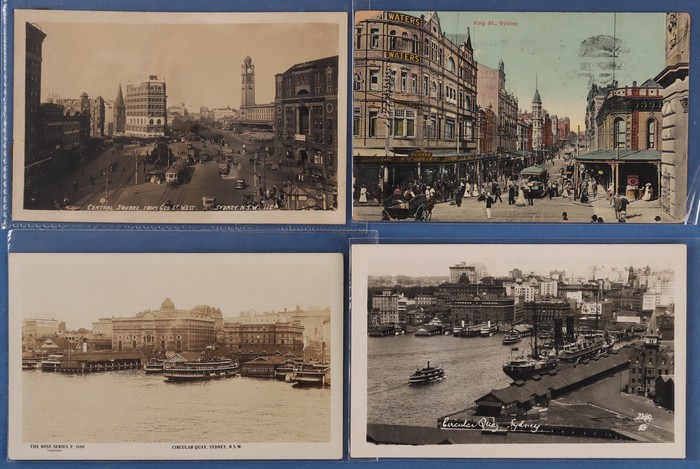 774 imageAustralia - NSW: City of Sydney & Environs early 1900s collection (135) with CBD Sights (75), noted Street Scenes (23) inc Argyle Cut, George, Hunter, Bridge, Pitt & Macquarie Streets, then Landmarks inc Archibald Memorial, Circular Quay, Hyde Park, Queens Square & Harbour Bridge Views. Then Inner/Outer Suburbs or Harbour Views (60) inc Central Railway Station, Lane Cove, Manly Wharf, Belmore Markets, Mosman, Watson & Wooloomooloo Bays. Mixed UN/U, generally F-VF condition. Also 10 assorted medium size 1920s-30s commercial photographs. (145) (Image1) (Image2) (Image3) (Image4) (Image5) (Image6) (Image7) (Image8) (Image9) (Image10) (Image11)