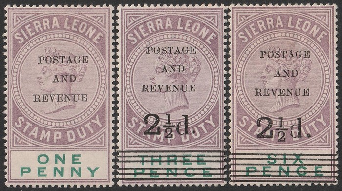REVENUE' opt QV Stamp Duty 1d, 2½d on 3d (SG type 8) & 2½d on 6d (SG type 8). VF fresh M. Scott 47, 48 & 53 cat US$33. SG 54, 55 & 59 cat £43. (3)