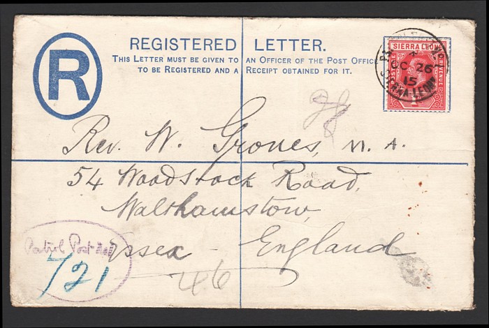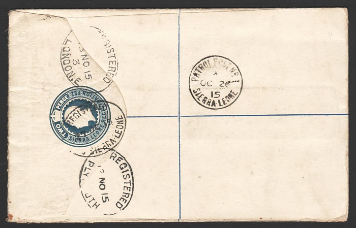 blue Registered Envelope with KGV 1d to pay postage to England, tied by 'Patrol Post No 1 Oct 26 15' cds, another as b/s with Plymouth & London, plus m/s reg details at LL. Likely a travelling foot PO serving a few villages along the coast south of
