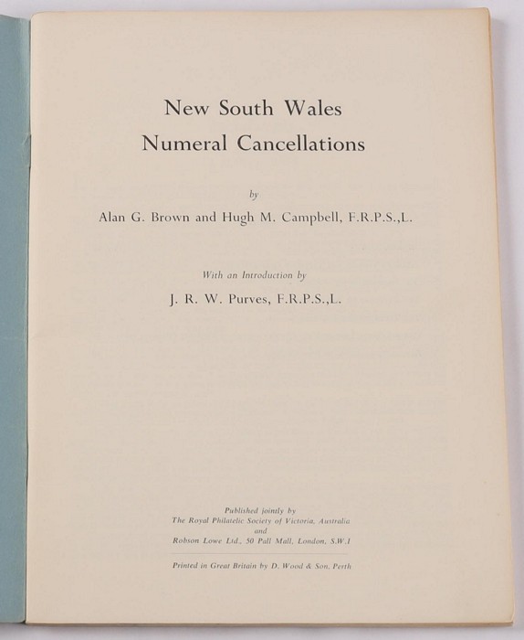 Wales Numeral Cancellations by Brown & Campbell. 80 pgs, pub 1963 by RPSV/Robson Lowe. VGC with minor scuffs. Now rarely seen. (Image1) (Image2)