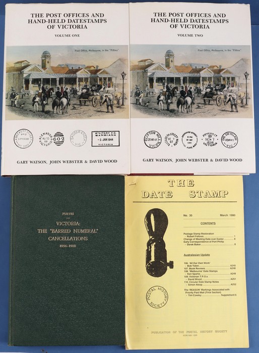 Barred Numeral Cancellation 1856-1912, by J R Purves, pub 1963. POs & Hand-held Date stamps of Victoria. Vols 1 & 2 by Watson, Wood & Webster, pub XXXX, XXXpgs. (3)
