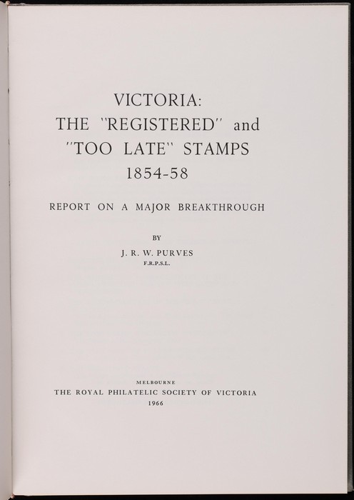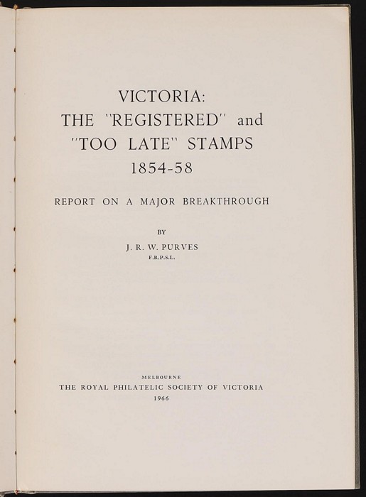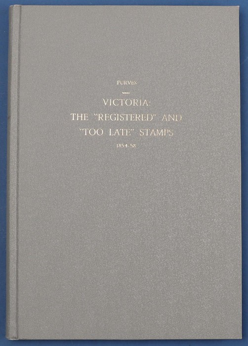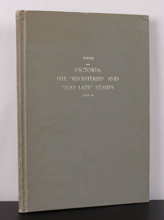 Registered & Too Late Stamps 1854-58 by Purves, 80pgs, plus photo plate folder. Minor cover wear, mainly on cnrs o/w VGC, contents near new. (Image1) (Image2)