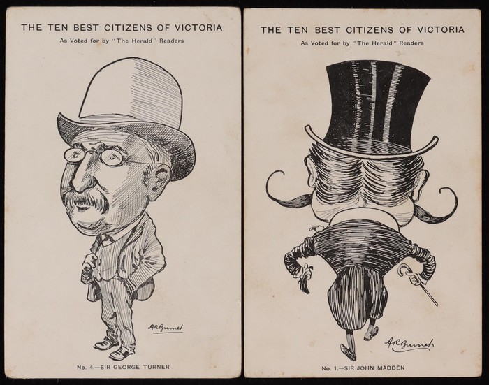 Buret 'The Ten Best Citizens of Victoria' group of 6 (numbered) inc Sir John Madden (No 1), Sir George Turner (No 4), Hon WH Irvine (No 7) & Hon George Coppin (No 10). Some minor foxing, F-VF condition. (6) (Image1) (Image2)