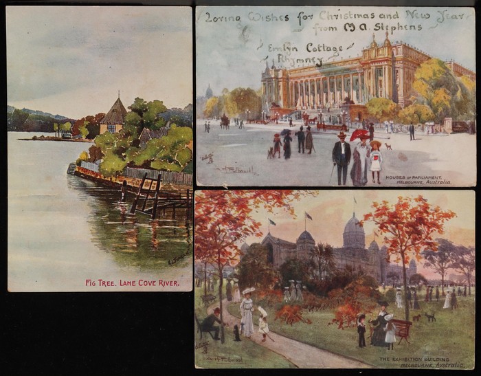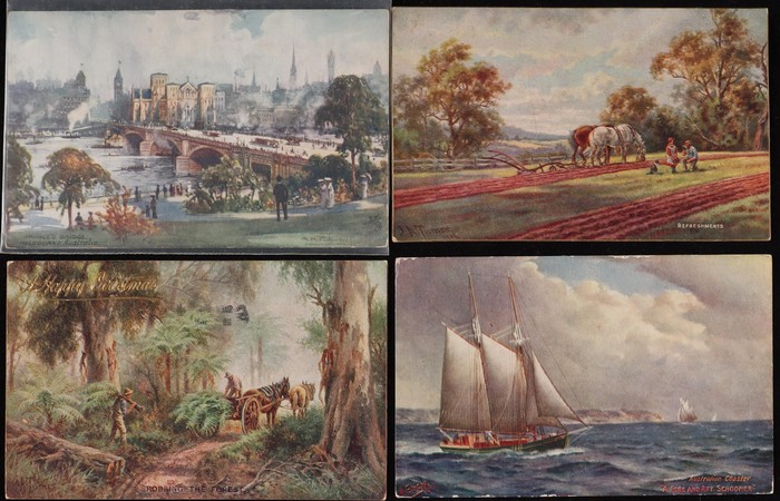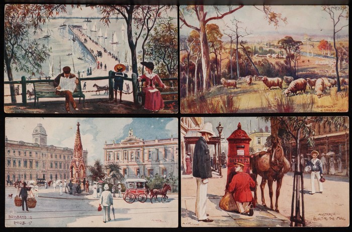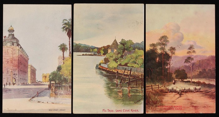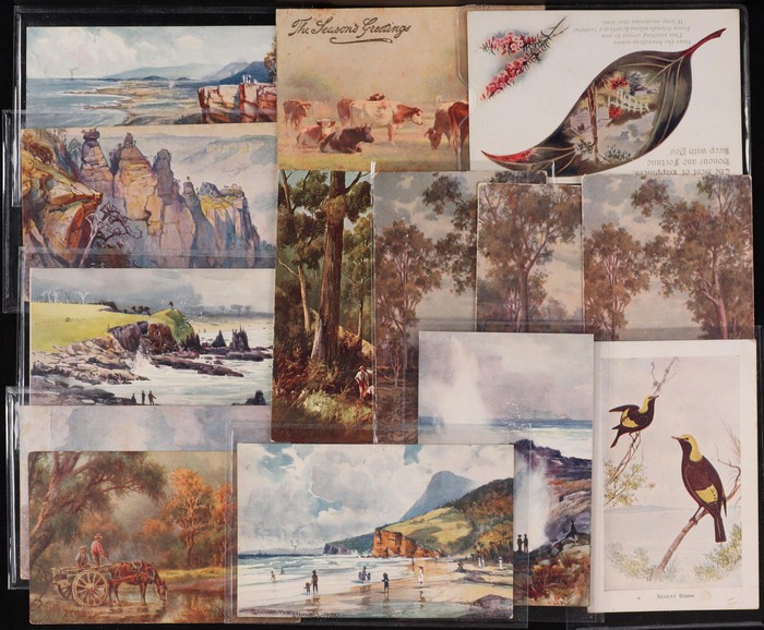 Fullwood Scenes (18) with Adelaide, Brisbane, Melbourne (6) & Sydney (2), Bush Views/Rural Industries (10) inc Healesville, Illawarra, A Sheep Station, Queenscliffe & Gold Mining (2). Mixed UN/U, F-VF condition. Also Deanne Taylor 'Williamstown' (2)