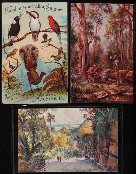 group (29) with Singer Sewing Machine 'Familiar Australian Songs' (1913 calendar rev). Fullwood 'Illawarra' series set of 6 inc Blowhole Kiama & Bulli Pass., plus Princes Bridge Melbourne & 5 more NSW Scenes inc Botanical Gardens Sydney. JA Turner