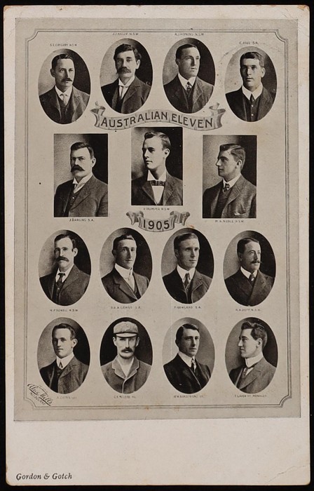 1905 Australian Eleven with the squad of 16 inc V Trumper, DR Gehrs, SE Gregory, JJ Kelly, AJ Hopkins & J Darling. Postally U 1905, sm cnr crease. F/VF. (Image1) (Image2)