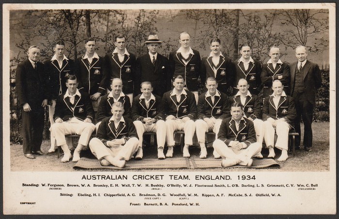 The Australian Cricket Team England 1934. Group photograph of the squad of 16 inc W Woodfill, Don Bradman, W O'reilly, L Darling, C Grimmett, A Kippax & W Oldfield. Cpl of light rev spots, F-VF UN. (Image1) (Image2)