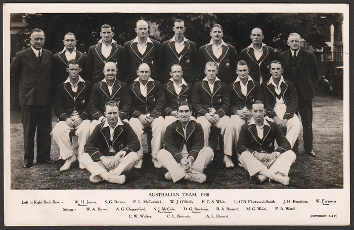 Australian Team 1938 group photograph pf the squad of 16 inc DG Bradman, SJ McCabe, W O'Reilly, AL Hassett, JH Fingleton & C W Walker. Cpl light rev spots, F-VF UN.