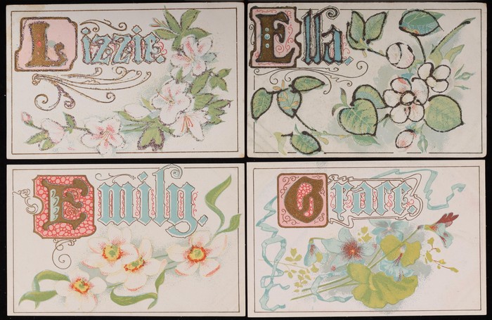 names, printed in colour with applied glitter, by VSM (Victoria Stamp Market) & Oceanic Stamp and Post Card Co, inc Agnes, Blanch, Daisy, Dorothy, Edith etc. All diff. (5)