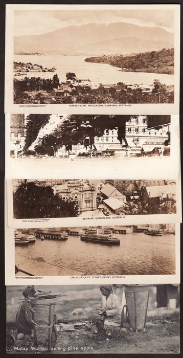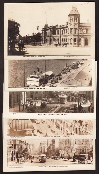 official PPC for 'Commonwealth Immigration Office - London' set of 6 rose 'real photos' one for each state inc Circular Quay Sydney & Collins St Melbourne. Then another 6 Australian cards inc Queen St Brisbane, Loading Wheat Adelaide & Stirling St